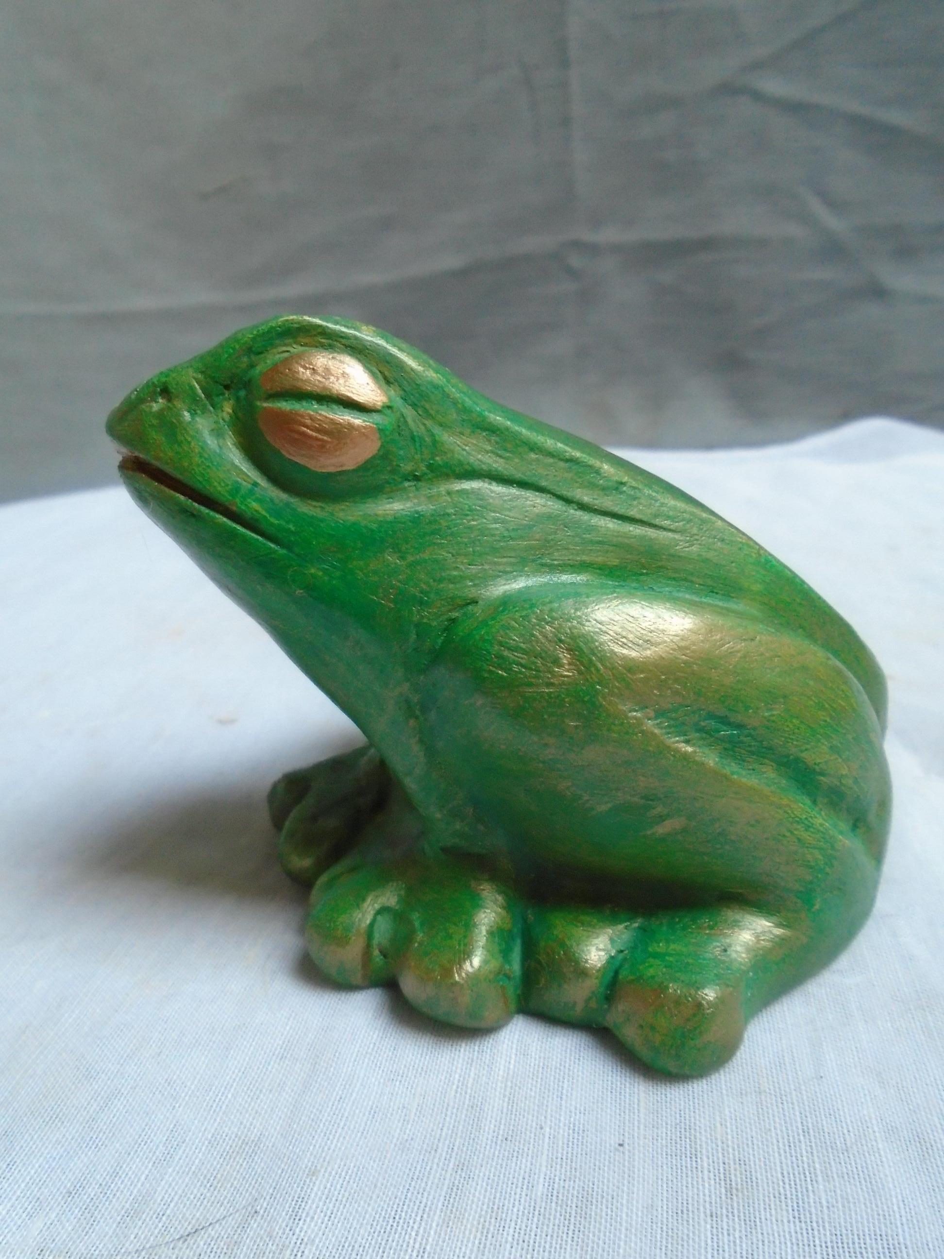 Grenouille verte terre cuite patinée et cirée, exposée à l'Atelier des Loys ,Villeréal.